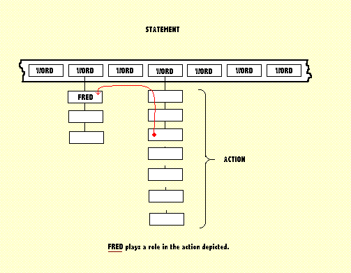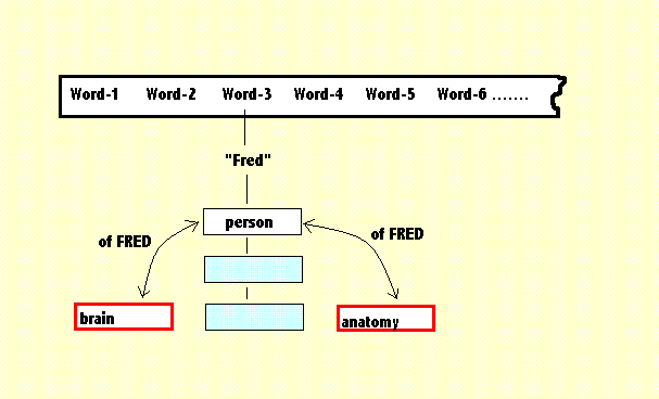 In this example we have no unusual information about FRED. The other words in the utterance which is being processed, have not been identified. One of them may be a verb. In which case it will probably involve some action. That action can be described - the movement of objects from one location to another. It may also have causal connections which could tell us why those objects moved. Perhaps Fred kicked a ball. If so, his leg must have moved so that his foot made contact with that ball. Persumably the ball then moved. Are we told the location? Are we told what caused that kick to take place. If it Fred's brain which caused his leg to move, then that kick was deliberate not accidental. All of that can be described in this narrative. The next diagram shows a later stage in the process. The problem then is to provide a mechanism by which the processing mechanism can discover who it is that is the agent of this action. It is at this point that syntactical knowledge becomes useful. It is my contention, however, that that knowledge is acquired by habit and repute. The person who acquires this knowledge does so by listening to others speaking. Notice the curved red arrow which links the structural location of the agent of the action, with the structure representing FRED. That red arrow represents a procedure lodged in the structure of the verb. That procedure seems to know where to look for the agent of the action and I suggest that that ability was acquired by listening to the prevailing speech patterns of the community. If the utterance had been expressed in passive voice, there would have been a different verb structure. The procedure which is embedded in the verb, conducts a search, and knows that if it encounters a verb-structure such as "has been" coupled with a past tense to produce the word sequence "has been kicked by" ... it knows that the normal search pattern must be reversed. That is a heuristic rule which can be learned (and if necessary unlearned). The rules of syntax are not immutable. They are characterised by fashionable trends. D.03 Other Word Groups There are various other word groups which need to be identified and located, before some utterances can be fully analysed. Perhaps the most important of these are the noun phrases and for that to be possible, the insights provided by syntax, become increasingly important. Fail that, there are two "fall-back" options or alternatives. (1) To ask for clarification. This is feasible when we are analysing the text of a conversation. (2) To develop and store alternative analyses - then process more of the text, in the hope that clarification may (eventualkly) be discovered. The single word "Fred" can be a single word noun phrase, which is why I chose that for my example. Other noun phrases may contain several words and can become quite complicated. There can (as in the example above), be several adjectives and adjectival phrases, all of which (as in this case), provide additional information to the main noun (dog). Sometimes the main noun is not always obvious. Sometimes too, there can be an ambiguous choice. And sometimes also there is a careless use of pronouns which is inherently ambiguous. In those instances, the technique I suggest is to embed a procedure within the meaning structure of each pronoun and this, when activated, will search backwards (the is, leftwards in the word sequence) in an attempt to discover a likely referent. Failing which we can adopt an appropriate "fall-back" option. The analysis of adjectives, is a search forwards (to the right) to find an approriate main noun. This can be complicated by noun phrses which contain two nouns, of which the first is being used as a kind of adjective - This type of confusion can usually be solved by adopting fall-back (2), which will often reveal that there seems to be an extra unattached noun. On the topic of other types of word groups, each natural language has various additional word-type which act as linguistic sign-posts. These can be read and used to direct and control the embedded search procedures as they try to find their appropriate referents. These are words and phrases, like "then", "by", "after", "while", "by means of", "which", "because", and so on. D.04 Context Dependency In the main text, in section 4.16, I discussed the issue of context dependency and introduced the example sentence - "John kicked Bill on the knee, one the spur of the moment, on a Saturday, on a bus, in anger, in December, in the middle of the night, in the middle of an argument .... " And drew attention to the different interpretations that might, in that example, be associated with the prepositions, "on" and "in". That is yet another example of context dependency. In each of the different cases, a word which follows the preposition, establishes a differect context. Consider, for example, the words "December", "bus" and "anger". "December" is a period of time (with a host of seasonal associations), the "bus" is a physical entity which has a mobile physical location while "anger" describes a state of mind (and an emotion) which carries with it an expectation of a particular kind of behaviour. In general the syntactical approach tries to classify these contexts - but not in these particular instances. The classifications are word-types - noun, prepositions, gerund, and so on. These are not a great deal of help. What we could do as an alternative, is to add some semantic information, which might be rather like a short entry in a dictionary. "Time Period", "Vehicle" and "Emotion". The interpretation of each prepositions would then start with a search for contextual clues of that kind, foilowed by a selection of what might be the most appropriate procedure which would then incorporate the meaning of the prepositional phrase into the growing depiction of the complete sentence. More detail could be added but I would prefer to resist that embellishment. The introduction of the phrase "in anger" is 